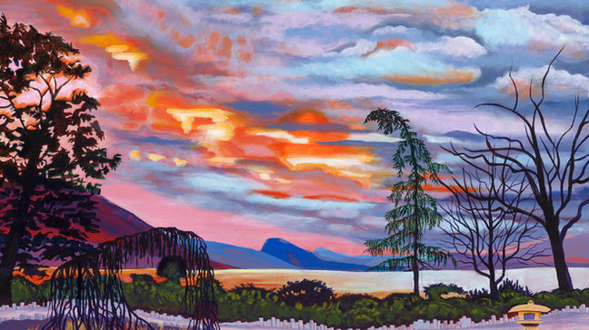 My paintings of individual trees and forests celebrate our spiritual connection to trees, and hopefully this art work inspires others to protect and conserve our precious green spaces. I wanted this painting to exude warmth, so I used colours that were analagous, yellow green, yellow orange, and red. The bright warm colours advance forward. I hope you feel an emotional impact while viewing this representational painting of our Okanagan forest.
